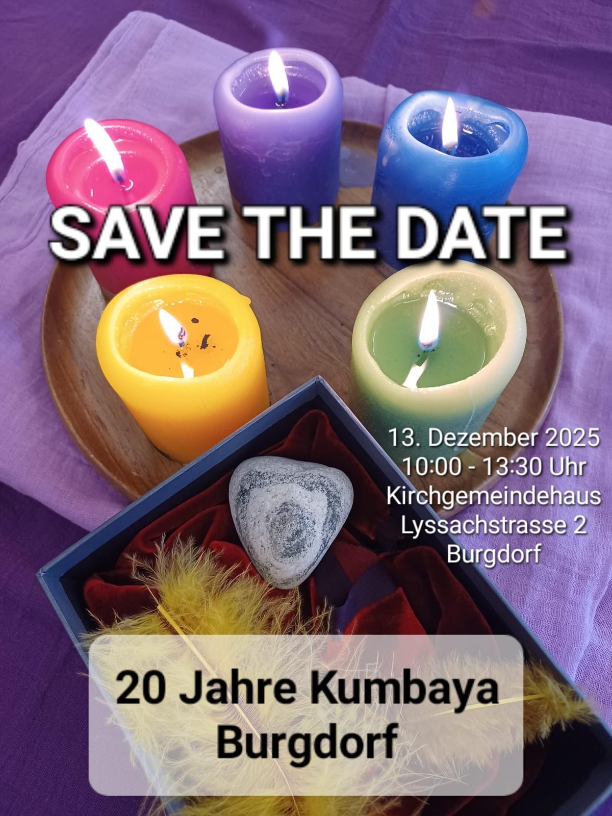 Zu unserer Jubiläumsfeier am 13. Dezember 2025 von 10.00 - 13.30 Uhr laden wir euch herzlich ein. Wir werden zusammen brunchen, eine Live-Musikgruppe geniessen und auf 20 Jahre Kumbaya zurückblicken.